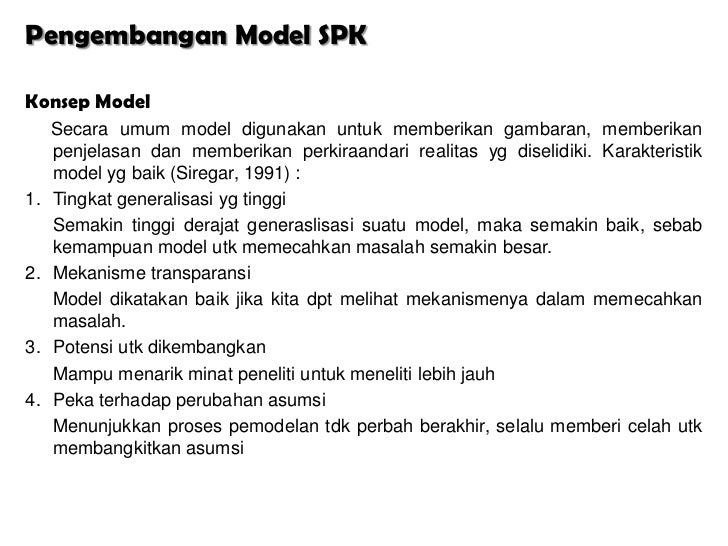 - 2. Pengembangan Model SPKKonsep Model Secara umum model digunakan untuk memberikan gambaran, memberikan penjelasan dan memberikan perkiraandari realitas yg diselidiki. Karakteristik model yg baik (Siregar, 1991) :1. Tingkat generalisasi yg tinggi Semakin tinggi derajat generaslisasi suatu model, maka semakin baik, sebab kemampuan model utk memecahkan masalah semakin besar.2. Mekanisme transparansi Model dikatakan baik jika kita dpt melihat mekanismenya dalam memecahkan masalah.3. Potensi utk dikembangkan Mampu menarik minat peneliti untuk meneliti lebih jauh4. Peka terhadap perubahan asumsi Menunjukkan proses pemodelan tdk perbah berakhir, selalu memberi celah utk membangkitkan asumsi