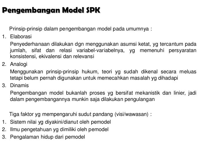 - 4. Pengembangan Model SPK Prinsip-prinsip dalam pengembangan model pada umumnya :1. Elaborasi Penyederhanaan dilakukan dgn menggunakan asumsi ketat, yg tercantum pada jumlah, sifat dan relasi variabel-variabelnya, yg memenuhi persyaratan konsistensi, ekivalensi dan relevansi2. Analogi Menggunakan prinsip-prinsip hukum, teori yg sudah dikenal secara meluas tetapi belum pernah digunakan untuk memecahkan masalah yg dihadapi3. Dinamis Pengembangan model bukanlah proses yg bersifat mekanistik dan linier, jadi dalam pengembangannya munkin saja dilakukan pengulangan Tiga faktor yg mempengaruhi sudut pandang (visi/wawasan) :1. Sistem nilai yg diyakini/dianut oleh pemodel2. Ilmu pengetahuan yg dimiliki oleh pemodel3. Pengalaman hidup dari pemodel