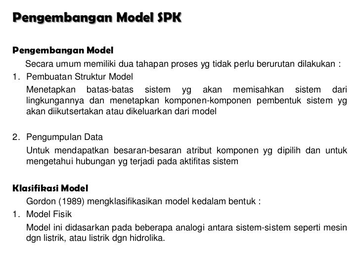 - 5. Pengembangan Model SPKPengembangan Model Secara umum memiliki dua tahapan proses yg tidak perlu berurutan dilakukan :1. Pembuatan Struktur Model Menetapkan batas-batas sistem yg akan memisahkan sistem dari lingkungannya dan menetapkan komponen-komponen pembentuk sistem yg akan diikutsertakan atau dikeluarkan dari model2. Pengumpulan Data Untuk mendapatkan besaran-besaran atribut komponen yg dipilih dan untuk mengetahui hubungan yg terjadi pada aktifitas sistemKlasifikasi Model Gordon (1989) mengklasifikasikan model kedalam bentuk :1. Model Fisik Model ini didasarkan pada beberapa analogi antara sistem-sistem seperti mesin dgn listrik, atau listrik dgn hidrolika.