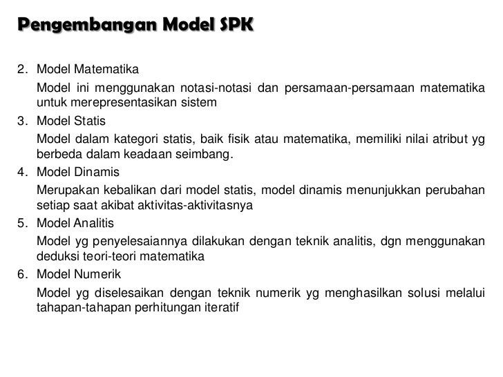 - 6. Pengembangan Model SPK2. Model Matematika Model ini menggunakan notasi-notasi dan persamaan-persamaan matematika untuk merepresentasikan sistem3. Model Statis Model dalam kategori statis, baik fisik atau matematika, memiliki nilai atribut yg berbeda dalam keadaan seimbang.4. Model Dinamis Merupakan kebalikan dari model statis, model dinamis menunjukkan perubahan setiap saat akibat aktivitas-aktivitasnya5. Model Analitis Model yg penyelesaiannya dilakukan dengan teknik analitis, dgn menggunakan deduksi teori-teori matematika6. Model Numerik Model yg diselesaikan dengan teknik numerik yg menghasilkan solusi melalui tahapan-tahapan perhitungan iteratif