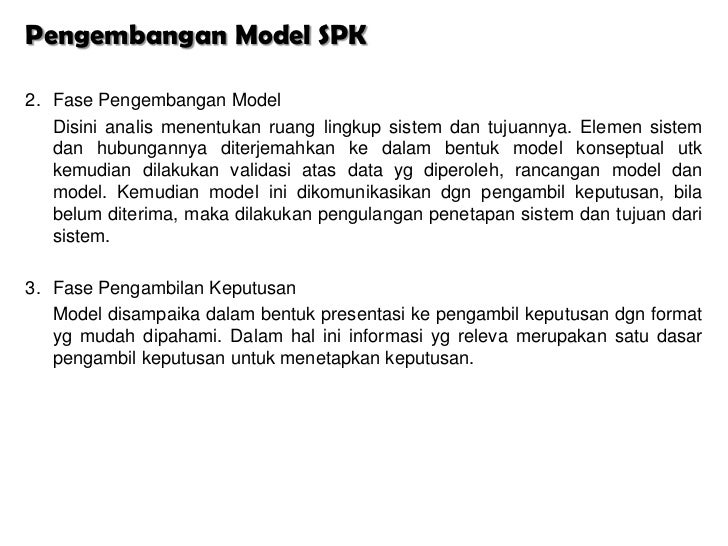 - 8. Pengembangan Model SPK2. Fase Pengembangan Model Disini analis menentukan ruang lingkup sistem dan tujuannya. Elemen sistem dan hubungannya diterjemahkan ke dalam bentuk model konseptual utk kemudian dilakukan validasi atas data yg diperoleh, rancangan model dan model. Kemudian model ini dikomunikasikan dgn pengambil keputusan, bila belum diterima, maka dilakukan pengulangan penetapan sistem dan tujuan dari sistem.3. Fase Pengambilan Keputusan Model disampaika dalam bentuk presentasi ke pengambil keputusan dgn format yg mudah dipahami. Dalam hal ini informasi yg releva merupakan satu dasar pengambil keputusan untuk menetapkan keputusan.