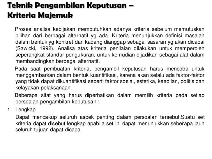 - 2. Teknik Pengambilan Keputusan –Kriteria Majemuk Proses analisa kebijakan membutuhkan adanya kriteria sebelum memutuskan pilihan dari berbagai alternatif yg ada. Kriteria menunjukkan definisi masalah dalam bentuk yg konkret dan kadang dianggap sebagai sasaran yg akan dicapai (Sawicki, 1992). Analisa atas kriteria penilaian dilakukan untuk memperoleh seperangkat standar pengukuran, untuk kemudian dijadikan sebagai alat dalam membandingkan berbagai alternatif. Pada saat pembuatan kriteria, pengambil keputusan harus mencoba untuk menggambarkan dalam bentuk kuantifikasi, karena akan selalu ada faktor-faktor yang tidak dapat dikuantifikasi seperti faktor sosial, estetika, keadilan, politis dan kelayakan pelaksanaan. Beberapa sifat yang harus diperhatikan dalam memilih kriteria pada setiap persoalan pengambilan keputusan :1. Lengkap Dapat mencakup seluruh aspek penting dalam persoalan tersebut.Suatu set kriteria dapat disebut lengkap apabila set ini dapat menunjukkan seberapa jauh seluruh tujuan dapat dicapai