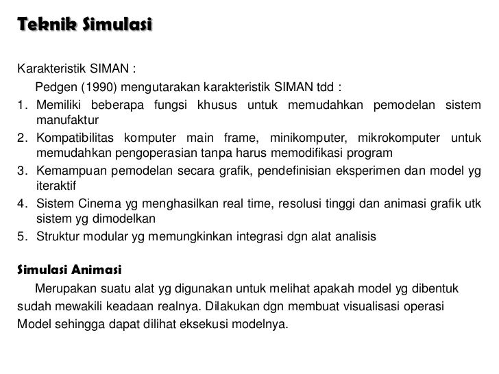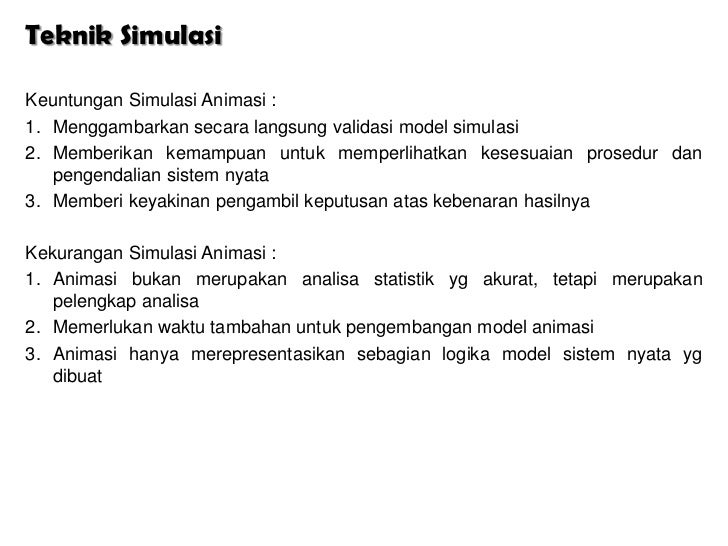 - 3. Teknik Simulasi1. Replicaticely Valid Data yg dibangkitkan sama dgn data yg sudah ada dari sistem yg nyata2. Predictively Valid Data yg dibangkitkan diperkirakan atau terlihat sama dgn data yg diambil dari dunia nyata3. Structurally Valid Model tersebut benar-benar menunjukkan pola tingkah laku sistem nyata Sebagai alat analisis, Model Simulasi memiliki kelebihan dan kekurangan sbb :A. Kelebihan : - Tidak semua sistem dapat dipresentasikan dalam bentuk model matematika, sehingga model ini mrpkn model alternatif - Model yg sdh dibuat dapat dipergunakan berulang utk menganalisa tujuan - Analisa dgn metode simulasi dpt dilakukan dgn input data yg bervariasi - Model ini dpt mengestimasi performansi suatu sistem pada kondisi tertentu - Model ini memungkinkan utk melakukan studi suatu sistem