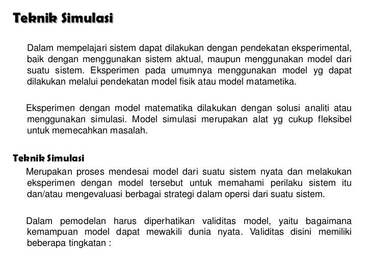 - 2. Teknik Simulasi Dalam mempelajari sistem dapat dilakukan dengan pendekatan eksperimental, baik dengan menggunakan sistem aktual, maupun menggunakan model dari suatu sistem. Eksperimen pada umumnya menggunakan model yg dapat dilakukan melalui pendekatan model fisik atau model matametika. Eksperimen dengan model matematika dilakukan dengan solusi analiti atau menggunakan simulasi. Model simulasi merupakan alat yg cukup fleksibel untuk memecahkan masalah.Teknik Simulasi Merupakan proses mendesai model dari suatu sistem nyata dan melakukan eksperimen dengan model tersebut untuk memahami perilaku sistem itu dan/atau mengevaluasi berbagai strategi dalam opersi dari suatu sistem. Dalam pemodelan harus diperhatikan validitas model, yaitu bagaimana kemampuan model dapat mewakili dunia nyata. Validitas disini memiliki beberapa tingkatan :