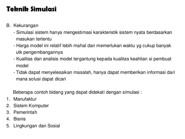 - 4. Teknik SimulasiB. Kekurangan - Simulasi sistem hanya mengestimasi karakteristik sistem nyata berdasarkan masukan tertentu - Harga model ini relatif lebih mahal dan memerlukan waktu yg cukup banyak utk pengembangannya - Kualitas dan analisis model tergantung kepada kualitas keahlian si pembuat model - Tidak dapat menyelesaikan masalah, hanya dapat memberikan informasi dari mana solusi dapat dicari Beberapa contoh bidang yang dapat didekati dengan simulasi :1. Manufaktur2. Sistem Komputer3. Pemerintah4. Bisnis5. Lingkungan dan Sosial