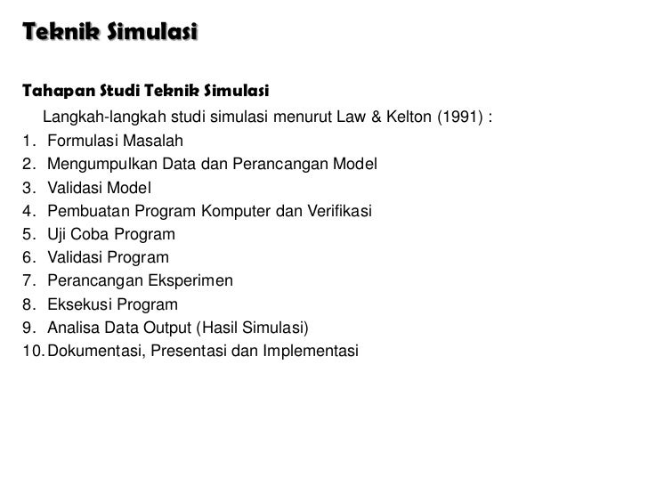 - 7. Teknik SimulasiTahapan Studi Teknik Simulasi Langkah-langkah studi simulasi menurut Law & Kelton (1991) :1. Formulasi Masalah2. Mengumpulkan Data dan Perancangan Model3. Validasi Model4. Pembuatan Program Komputer dan Verifikasi5. Uji Coba Program6. Validasi Program7. Perancangan Eksperimen8. Eksekusi Program9. Analisa Data Output (Hasil Simulasi)10. Dokumentasi, Presentasi dan Implementasi