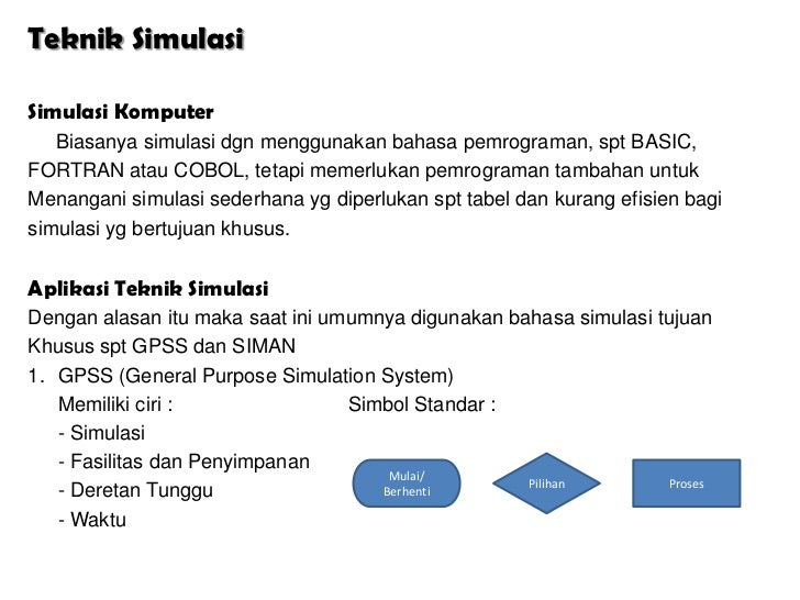- 8. Teknik SimulasiSimulasi Komputer Biasanya simulasi dgn menggunakan bahasa pemrograman, spt BASIC,FORTRAN atau COBOL, tetapi memerlukan pemrograman tambahan untukMenangani simulasi sederhana yg diperlukan spt tabel dan kurang efisien bagisimulasi yg bertujuan khusus.Aplikasi Teknik SimulasiDengan alasan itu maka saat ini umumnya digunakan bahasa simulasi tujuanKhusus spt GPSS dan SIMAN1. GPSS (General Purpose Simulation System) Memiliki ciri : Simbol Standar : - Simulasi - Fasilitas dan Penyimpanan Mulai/ Pilihan Proses - Deretan Tunggu Berhenti - Waktu